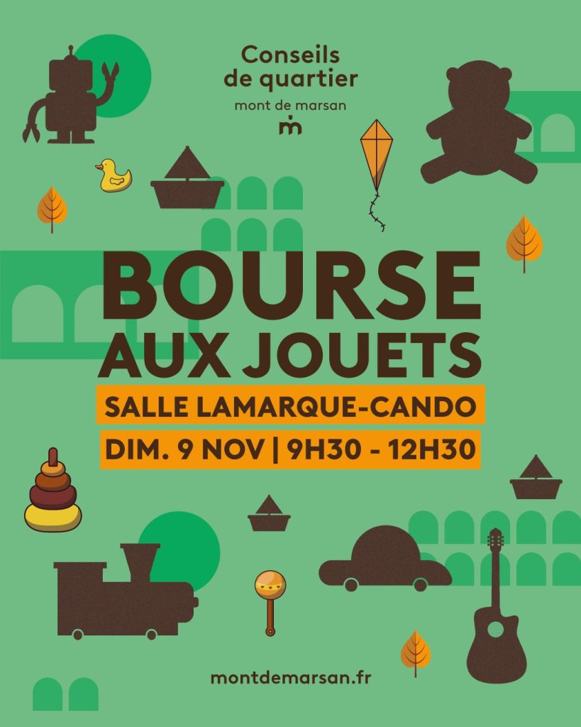 La Ville de Mont-de-Marsan communique sur l’organisation d’une bourse aux jouets le dimanche 9 novembre, de 9h30 à 12h30. L’événement se tiendra à la salle Lamarque-Cando, située allée Raymond Farbos, dans le centre-ville montois.